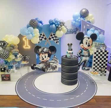 $800 – RELAX: party planner service + party project + cut name + number + 1 themed backdrops + matching backdrops + 2 prop or backdrop or table + matching floor banner + cylinders + tables + decor elements + extra balloon garland + themed invitation.