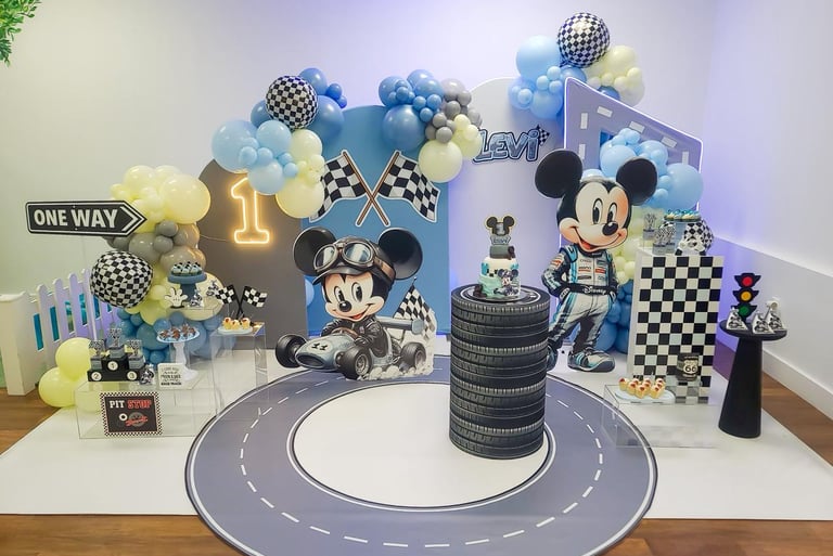$600 – ESSENTIAL: Cut name or led number + 1 theme backdrop or prop that themed costumed + 1 matching backdrop stock only + cylinders + tables + decor elements + balloon garland.